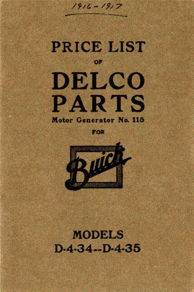 6" x 9", 18 pages. Book is very well illustrated. Presents a listing of the service part numbers and service part number prices for the Delco Motor generator No. 115 as used on the 1917 Buick Models D-4-34 and D-4-35.